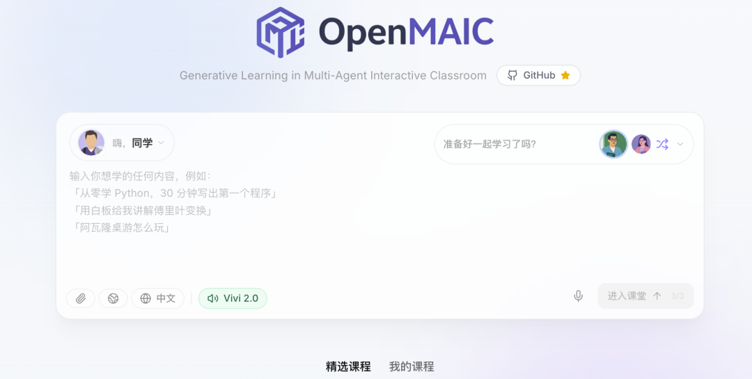 git clone https://github.com/THU-MAIC/OpenMAIC.gitcd OpenMAICpnpm installcp .env.example .env.localpnpm dev