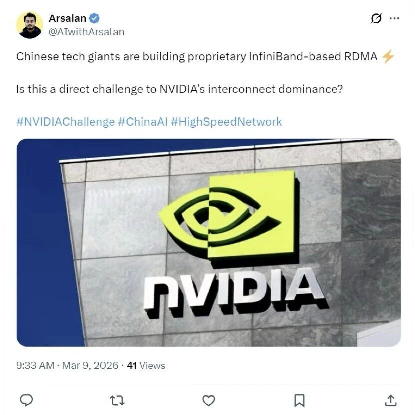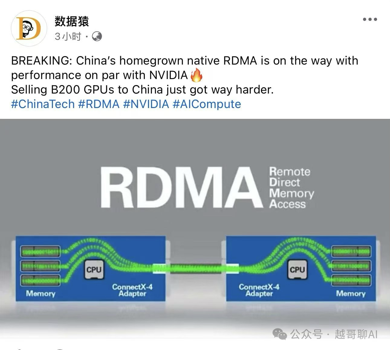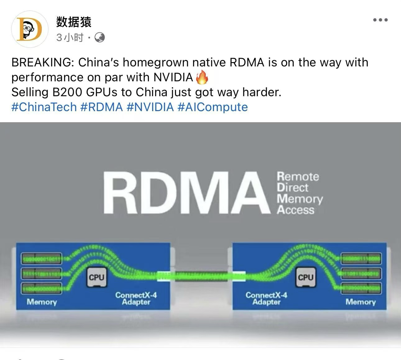 刚收到的外网爆料,值得玩味。<br><br>据相关消息人士透露,国内某头部算力厂商已在原生RDMA技术上取得实质性突破,即将推出对标InfiniBand的高速互联方案。如果属实,这将是国产AI算力进程中一次关键转向——从RoCE的“改良路线”,正式杀入IB的“原生战场”。<br>想要看懂这条新闻,需要理解超大规模智算集群的真实痛点。<br><br>前两天,两会点题的“超大规模智算集群”,落在工程层面,核心就一句话:当集群从千卡向万卡、十万卡狂奔时,网络不再是管道,而是龙骨。大模型训练的通信模式,本质是数万张卡同时做全局同步,任何一次丢包、任何一纳秒抖动,都会被成倍放大,直接折算成算力闲置。<br><br>具体来看,目前的主流方案,各有各的命门。<br><br>RoCE的算盘是在以太网上跑RDMA,成本友好,生态开放,在中小规模集群里足够能打。但它的基因是“尽力而为”,缺乏端到端的无损机制。上到400G高速互联,物理层的先天短板就暴露了——更关键的是,高端交换芯片和网卡芯片的供应,现阶段不完全由我们说了算。<br><br>IB的护城河在于原生无损。它基于信用的流控机制,传输前先确认接收端资源,延迟压到100纳秒级,几乎零丢包。这是为极限场景设计的奢侈体验,代价是封闭生态和英伟达的整合锁死。<br><br>爆料里提到的突破,卡位的正是这个缝隙——原生无损RDMA,兼容主流IB生态,专攻十万卡级集群。这意味着什么?<br><br>第一,国产算力第一次有了万卡级互联的“入场券”。不再依赖RoCE的修修补补,直接对标IB的性能基线,集群规模的天花板被实质性顶开。<br><br>第二,这是对英伟达护城河的精准打击。继CUDA之后,InfiniBand是其在AI算力领域的另一道深壕。国产厂商从网络层切入,打的是算力基建的“底层桩”。<br><br>第三,路线选择的信号已经明确。RoCE的生态位依然存在,但面向超大规模集群,国家队选择的是原生RDMA这条硬骨头路线。<br><br>想到一句评价很到位:“继5G/6G之后,中国在新一代AI基础设施领域的又一重要布局。”这场连接之战,比芯片更隐蔽,却同样决定算力主权的边界。<br><br>国产算力的第二曲线,这次是真的切进了深水区。