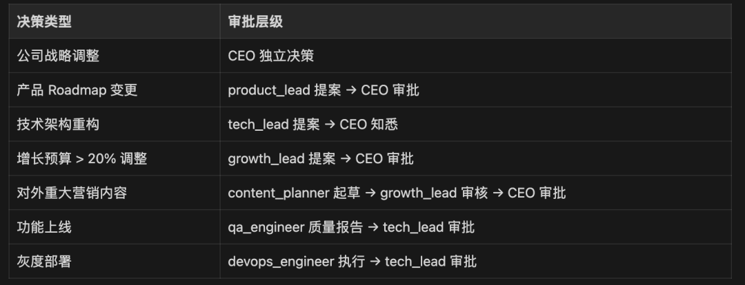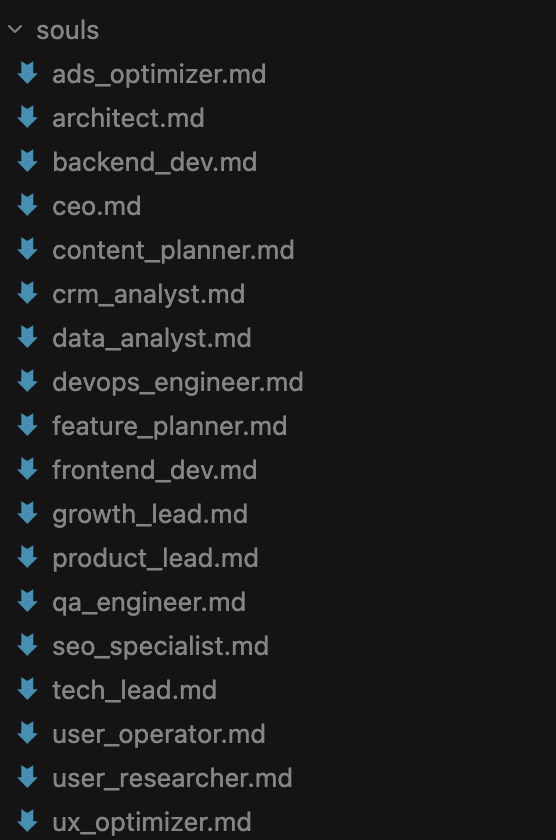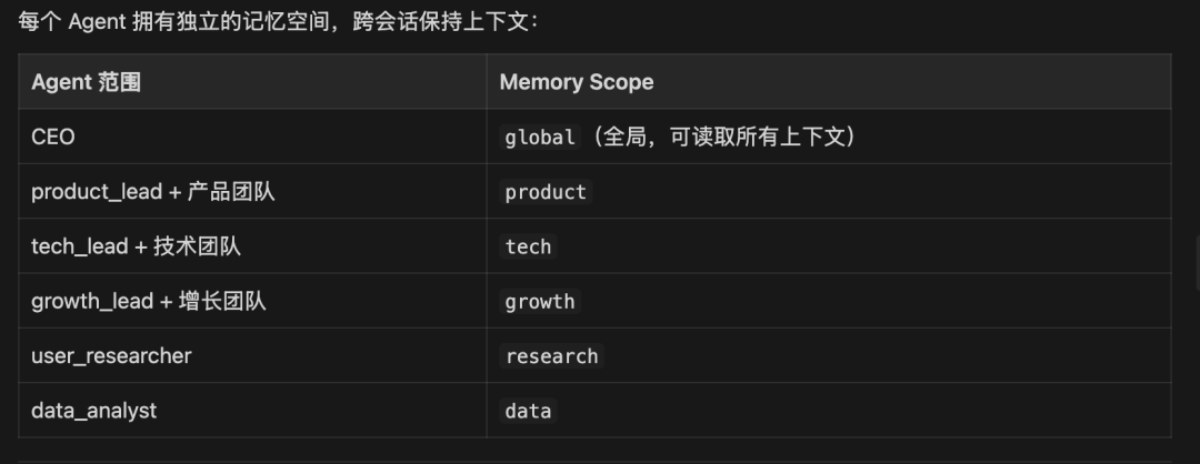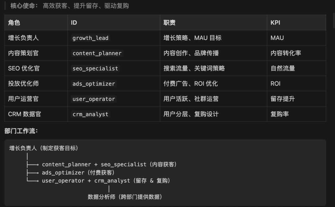 { "agents": { "list": [ { "id": "ceo_assistant", "name": "CEO助理", "soul": "souls/ceo_assistant.md" }, { "id": "strategy_finance", "name": "战略财务官", "soul": "souls/strategy_finance.md" }, { "id": "product_lead", "name": "产品负责人", "soul": "souls/product_lead.md" }, { "id": "user_researcher", "name": "用户研究官", "soul": "souls/user_researcher.md" }, { "id": "data_analyst", "name": "数据分析师", "soul": "souls/data_analyst.md" }, { "id": "growth_experimenter", "name": "增长实验官", "soul": "souls/growth_experimenter.md" }, { "id": "feature_planner", "name": "功能策划官", "soul": "souls/feature_planner.md" }, { "id": "ux_optimizer", "name": "体验优化官", "soul": "souls/ux_optimizer.md" }, { "id": "tech_lead", "name": "技术负责人", "soul": "souls/tech_lead.md" }, { "id": "architect", "name": "系统架构师", "soul": "souls/architect.md" }, { "id": "fullstack_dev", "name": "全栈工程师", "soul": "souls/fullstack_dev.md" }, { "id": "backend_dev", "name": "后端工程师", "soul": "souls/backend_dev.md" }, { "id": "qa_engineer", "name": "QA测试官", "soul": "souls/qa_engineer.md" }, { "id": "devops_engineer", "name": "DevOps运维官", "soul": "souls/devops_engineer.md" }, { "id": "growth_lead", "name": "增长负责人", "soul": "souls/growth_lead.md" }, { "id": "content_planner", "name": "内容策划官", "soul": "souls/content_planner.md" }, { "id": "social_operator", "name": "社媒运营官", "soul": "souls/social_operator.md" }, { "id": "ads_optimizer", "name": "投放优化师", "soul": "souls/ads_optimizer.md" }, { "id": "user_operator", "name": "用户运营官", "soul": "souls/user_operator.md" }, { "id": "crm_analyst", "name": "CRM数据官", "soul": "souls/crm_analyst.md" } ] }, "channels": { "feishu": { "accounts": [ { "agentId": "ceo_assistant", "app_id": "APP_ID_1", "app_secret": "APP_SECRET_1" }, { "agentId": "strategy_finance", "app_id": "APP_ID_2", "app_secret": "APP_SECRET_2" }, { "agentId": "product_lead", "app_id": "APP_ID_3", "app_secret": "APP_SECRET_3" }, { "agentId": "user_researcher", "app_id": "APP_ID_4", "app_secret": "APP_SECRET_4" }, { "agentId": "data_analyst", "app_id": "APP_ID_5", "app_secret": "APP_SECRET_5" }, { "agentId": "growth_experimenter", "app_id": "APP_ID_6", "app_secret": "APP_SECRET_6" }, { "agentId": "feature_planner", "app_id": "APP_ID_7", "app_secret": "APP_SECRET_7" }, { "agentId": "ux_optimizer", "app_id": "APP_ID_8", "app_secret": "APP_SECRET_8" }, { "agentId": "tech_lead", "app_id": "APP_ID_9", "app_secret": "APP_SECRET_9" }, { "agentId": "architect", "app_id": "APP_ID_10", "app_secret": "APP_SECRET_10" }, { "agentId": "fullstack_dev", "app_id": "APP_ID_11", "app_secret": "APP_SECRET_11" }, { "agentId": "backend_dev", "app_id": "APP_ID_12", "app_secret": "APP_SECRET_12" }, { "agentId": "qa_engineer", "app_id": "APP_ID_13", "app_secret": "APP_SECRET_13" }, { "agentId": "devops_engineer", "app_id": "APP_ID_14", "app_secret": "APP_SECRET_14" }, { "agentId": "growth_lead", "app_id": "APP_ID_15", "app_secret": "APP_SECRET_15" }, { "agentId": "content_planner", "app_id": "APP_ID_16", "app_secret": "APP_SECRET_16" }, { "agentId": "social_operator", "app_id": "APP_ID_17", "app_secret": "APP_SECRET_17" }, { "agentId": "ads_optimizer", "app_id": "APP_ID_18", "app_secret": "APP_SECRET_18" }, { "agentId": "user_operator", "app_id": "APP_ID_19", "app_secret": "APP_SECRET_19" }, { "agentId": "crm_analyst", "app_id": "APP_ID_20", "app_secret": "APP_SECRET_20" } ] } }, "bindings": [ { "agentId": "ceo_assistant", "channel": "feishu" }, { "agentId": "strategy_finance", "channel": "feishu" }, { "agentId": "product_lead", "channel": "feishu" }, { "agentId": "user_researcher", "channel": "feishu" }, { "agentId": "data_analyst", "channel": "feishu" }, { "agentId": "growth_experimenter", "channel": "feishu" }, { "agentId": "feature_planner", "channel": "feishu" }, { "agentId": "ux_optimizer", "channel": "feishu" }, { "agentId": "tech_lead", "channel": "feishu" }, { "agentId": "architect", "channel": "feishu" }, { "agentId": "fullstack_dev", "channel": "feishu" }, { "agentId": "backend_dev", "channel": "feishu" }, { "agentId": "qa_engineer", "channel": "feishu" }, { "agentId": "devops_engineer", "channel": "feishu" }, { "agentId": "growth_lead", "channel": "feishu" }, { "agentId": "content_planner", "channel": "feishu" }, { "agentId": "social_operator", "channel": "feishu" }, { "agentId": "ads_optimizer", "channel": "feishu" }, { "agentId": "user_operator", "channel": "feishu" }, { "agentId": "crm_analyst", "channel": "feishu" } ], "tools": { "agentToAgent": { "enabled": true, "allow": ["*"], "maxRecursion": 3 }, "memory": { "enabled": true, "type": "long_term" } }}