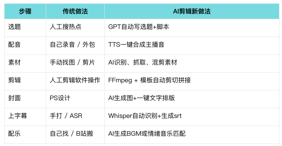 下面我举几个常见“剪辑流程”被AI改造的点: